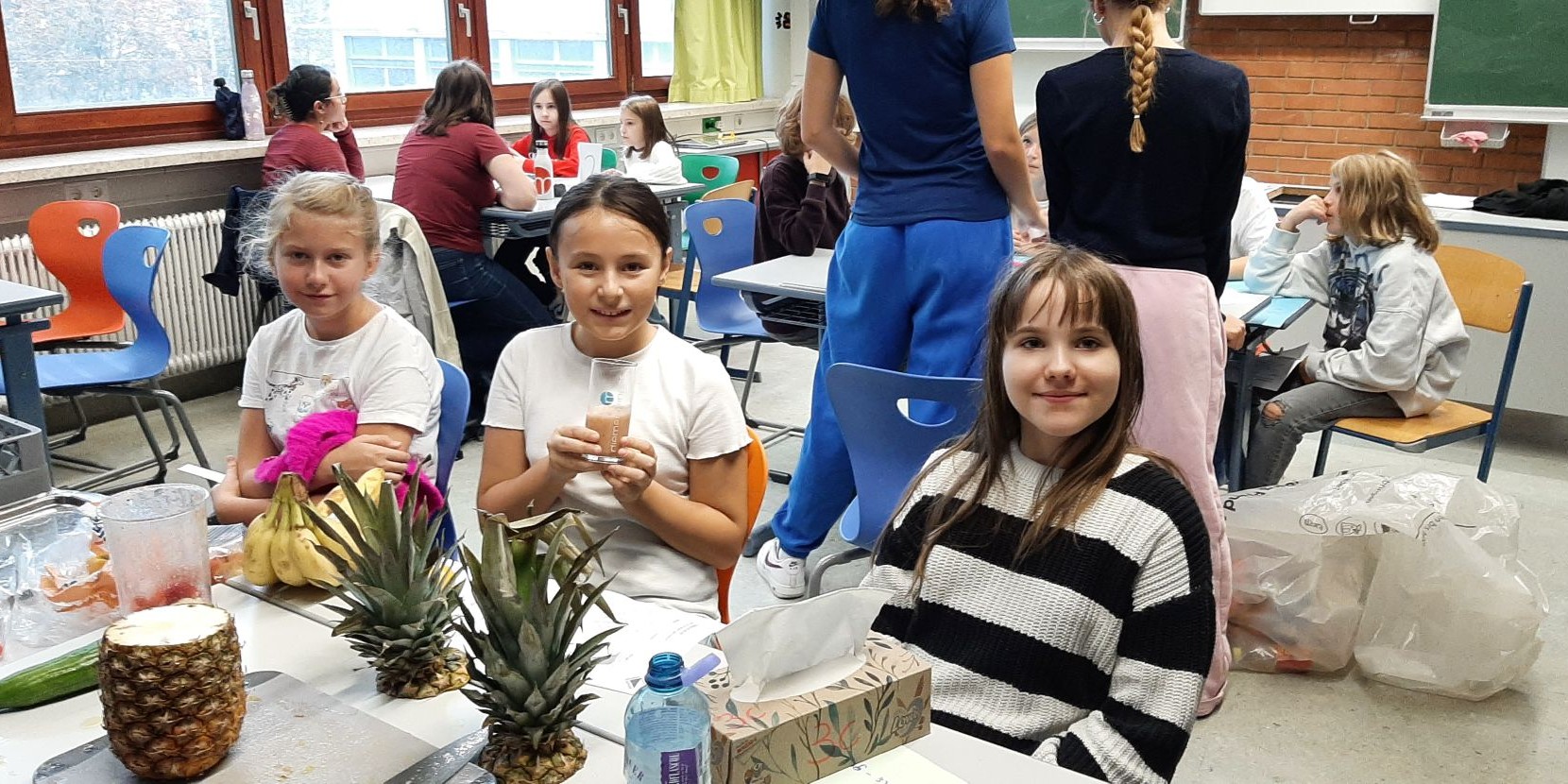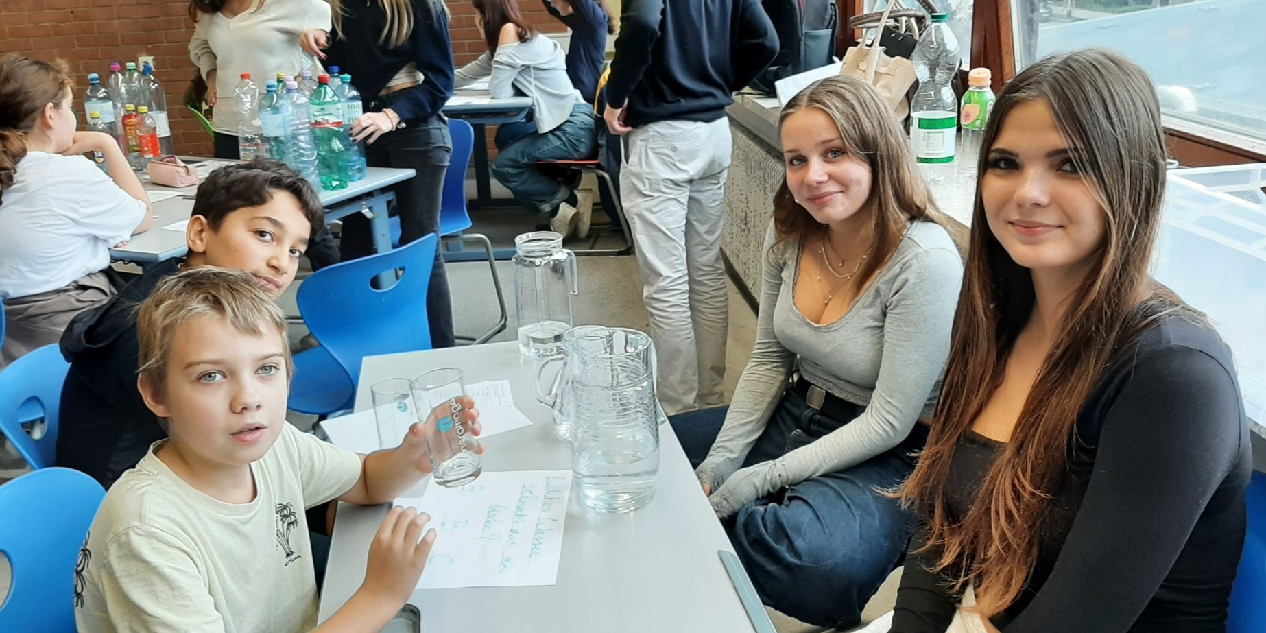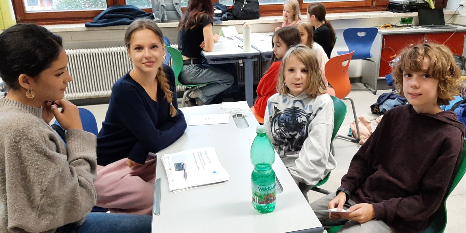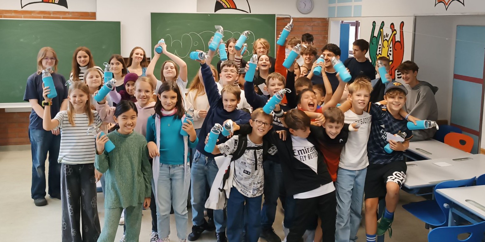 Im September nahmen unsere Schüler:innen der 1. Klassen wieder am Wasserworkshop teil. Zahlreiche Info- und Erlebnisstationen machten Lust aufs Trinken von Wasser. Von engagierten Schüler:innen der 7. Klassen gestaltet und betreut, vermittelten die Workshops den Erstklässler:innen mit viel Know-how und anschaulichem Material unter anderem, welche Getränke wie viel Zucker enthalten und woran man das erkennt. Frisch gemixte Smoothies weckten die Freude an gesunden Alternativen und an der Sportstation lernten die Kinder den Kalorienverbrauch bei einer zweiminütigen intensiven Bewegung kennen. Quizfragen sowie ein Check des eigenen Trinkverhaltens rundeten die zweistündigen Workshops ab. Als Belohnung gab es die Maroltinger Wasserflasche. Wir bedanken uns herzlich bei den Schüler:innen der 7. Klassen für ihr großartiges Engagement und bei den Erstklässler:innen für ihre aktive Teilnahme.