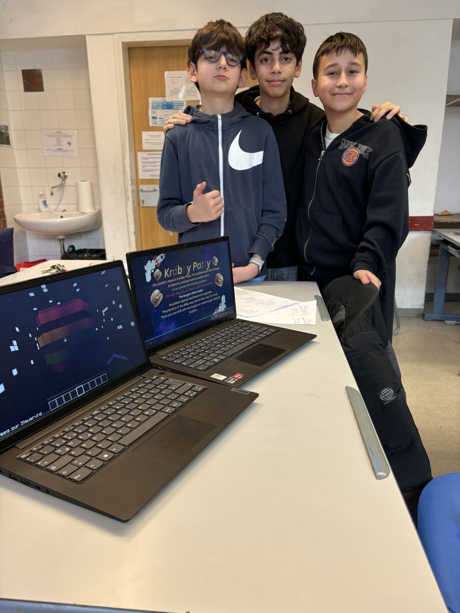 In Gruppen entwickelten die Kinder eigene fantasievolle Planeten und setzten ihre Ideen auf vielfältige Weise um. Zunächst gestalteten sie in Canva ansprechende Poster, auf denen sie ihren Planeten vorstellten und wichtige Informationen dazu präsentierten. Anschließend bauten sie ihre erfundenen Welten mit viel Kreativität und Engagement in Minecraft nach.