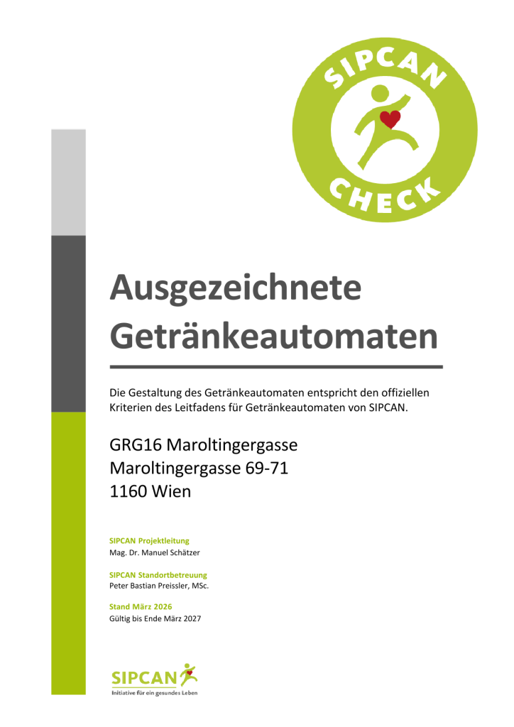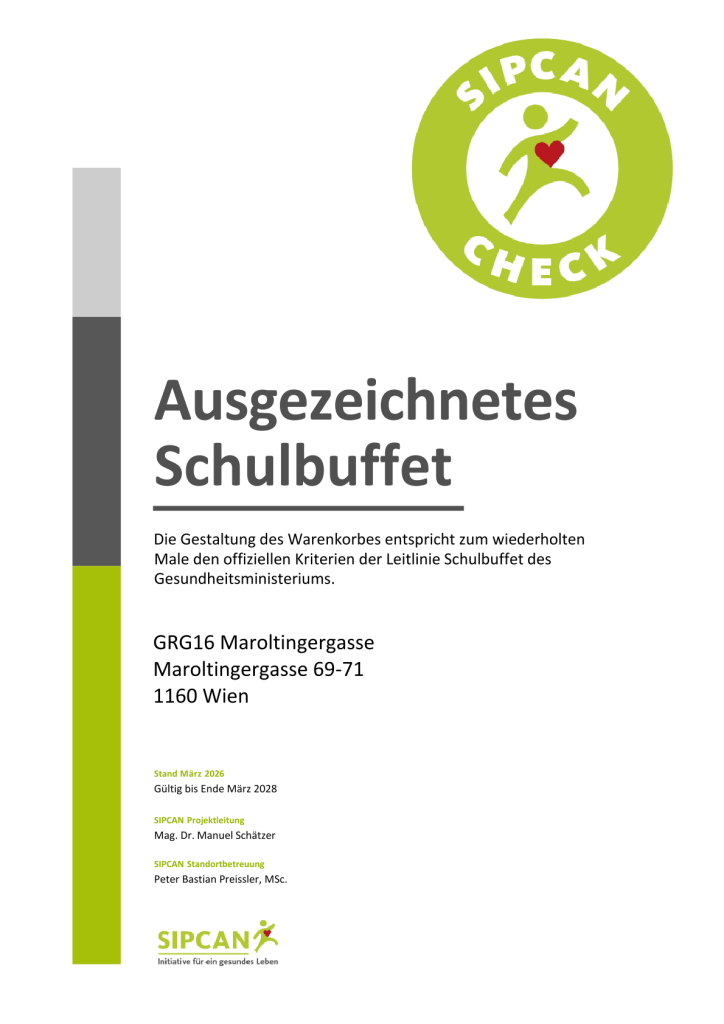 Eine gesunde und ausgewogene Pausenverpflegung liegt unserer Schule am Herzen! Aus diesem Grund nimmt unsere Buffetbetreiberin Susanne Partej am Schulbuffet-Check teil. Das Warenangebot wurde nun im Rahmen des Schulbuffet-Checks vom vorsorgemedizinischen Institut SIPCAN überprüft. Die Kriterien der „Leitlinie Schulbuffet“ des Gesundheitsministeriums werden an unserem Schulbuffet sowie an unserem Kaltgetränkeautomaten erfolgreich umgesetzt.
