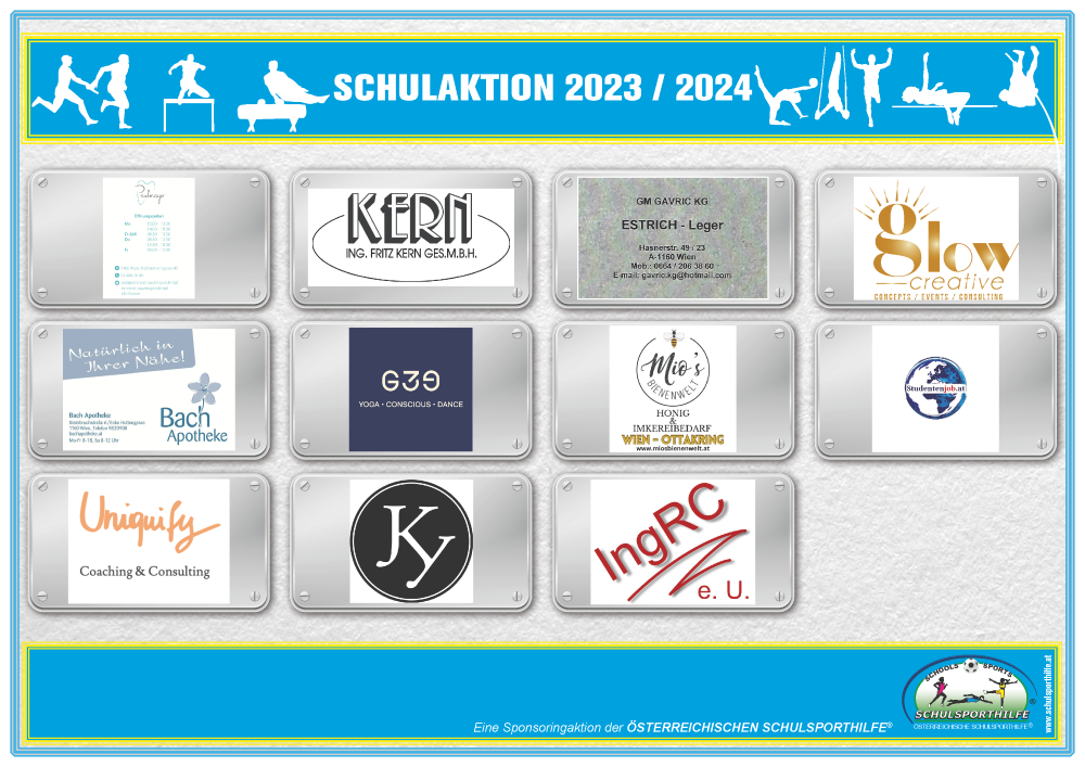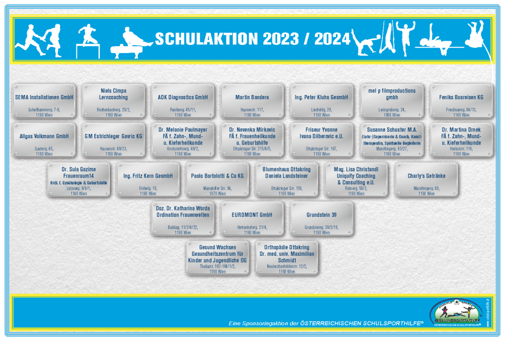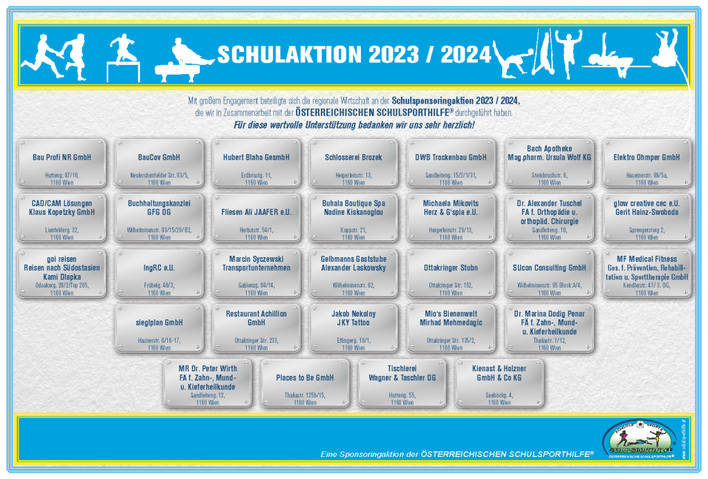 Erstmals wurde heuer von der Österreichischen Schulsporthilfe® eine Sponsoring-Aktion für das GRG16 Maroltingergasse durchgeführt. Dank der hervorragenden Unterstützung vieler örtlicher Gewerbetreibenden ist es uns nun möglich, das Repertoire der sportlichen Grundausstattung um einiges zu erweitern und so den Unterricht noch attraktiver zu gestalten. Die Freude ist sowohl beim Sportkollegium als auch bei den Schülerinnen und Schülern riesengroß. Wir bedanken uns ganz herzlich bei allen 55 Sponsorinnen und Sponsoren, die dem GRG16 Maroltingergasse diese Zusatzausstattung ermöglicht haben. Alle Namen der engagierten Sponsorenschaft sind sowohl auf unserer Website zu sehen als auch auf der Aushangliste beim Haupteingang unserer Schule ersichtlich. Vielen Dank!