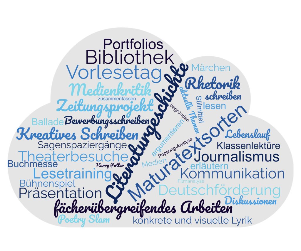 Wir besuchen außerdem regelmäßig gemeinsam Theatervorstellungen und organisieren abwechslungsreiche Lehrausgänge, wie beispielsweise in Bibliotheken, zu Redewettbewerben oder Poetry-Slam-Aufführungen. In der Unterstufe bieten wir die unverbindliche Übung „Bühnenspiel“ an, in der vieles ausprobiert, gespielt, wild getobt, dramatisch geschrien, frei improvisiert, an Stücken getüftelt und an der Bühnen- und Stimmpräsenz gearbeitet wird. In der Oberstufe liegt der Fokus nicht nur auf der Maturavorbereitung, sondern es finden auch unterschiedliche Projekte, wie z.B. „Kommunikation und Präsentation“ (5. Klasse), statt.